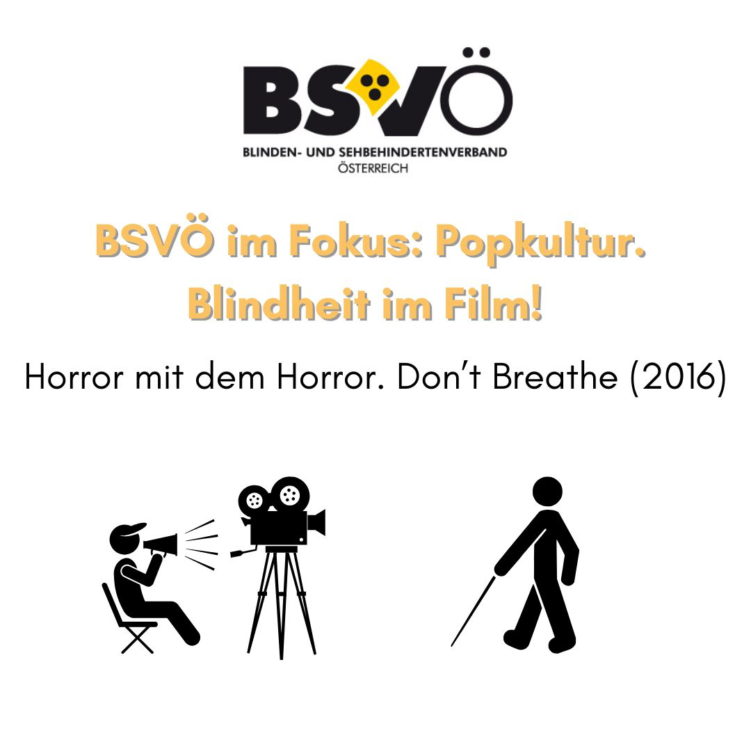 "BSVÖ Fokus Popkultur. Blindheit im Film! Horror mit dem Horror. Don’t Breathe (2016)" Grafik eines Filmsets mit blinder Person.