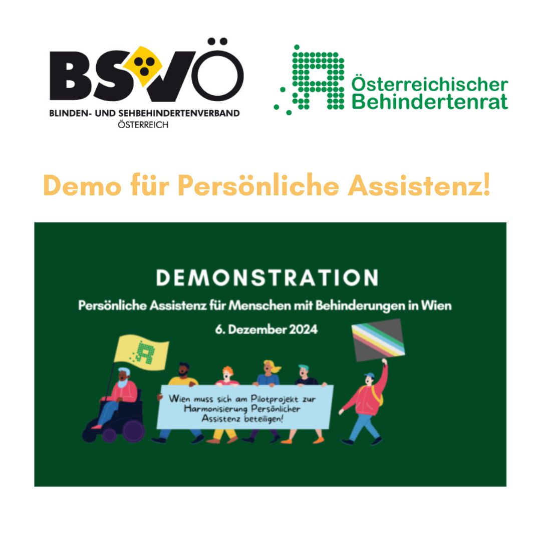 Logos BSVÖ, Österreichischer Behindertenrat. Grünes Rechteck, Zeichnung demonstrierender Menschen. Text Demonstration. Persönliche Assistenz für Menschen mit Behinderungen in Wien. 6. Dezember 2024. Wien muss sich am Pilotprojekt zur Harmonisierung Persönlicher Assistenz beteiligen!