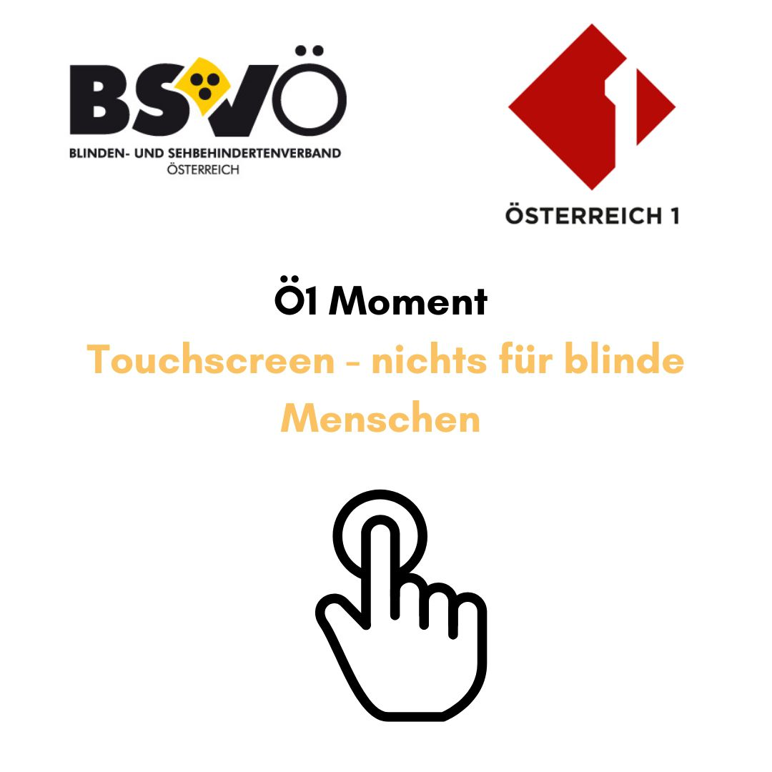 "Ö1 Moment. Touchscreen - nichts für blinde Menschen" Grafik einer Hand, die einen Punkt berührt. Logos BSVÖ und Ö1