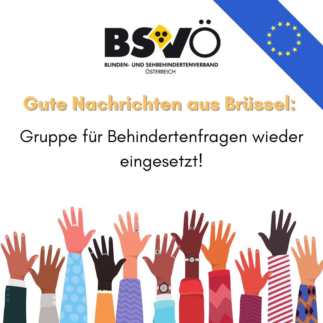 "Gute Nachrichten aus Brüssel: Gruppe für Behindertenfragen wieder eingesetzt" Logo BSVÖ, EU, Grafik von vielen Armen, die sich gemeinsam nach oben strecken
