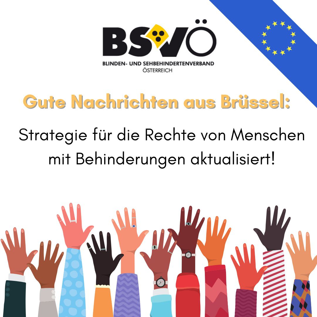 "Gute Nachrichten aus Brüssel: Strategie für die Rechte von Menschen mit Behinderungen aktualisiert!" Logo BSVÖ, EU, Grafik von vielen Armen, die sich gemeinsam nach oben strecken