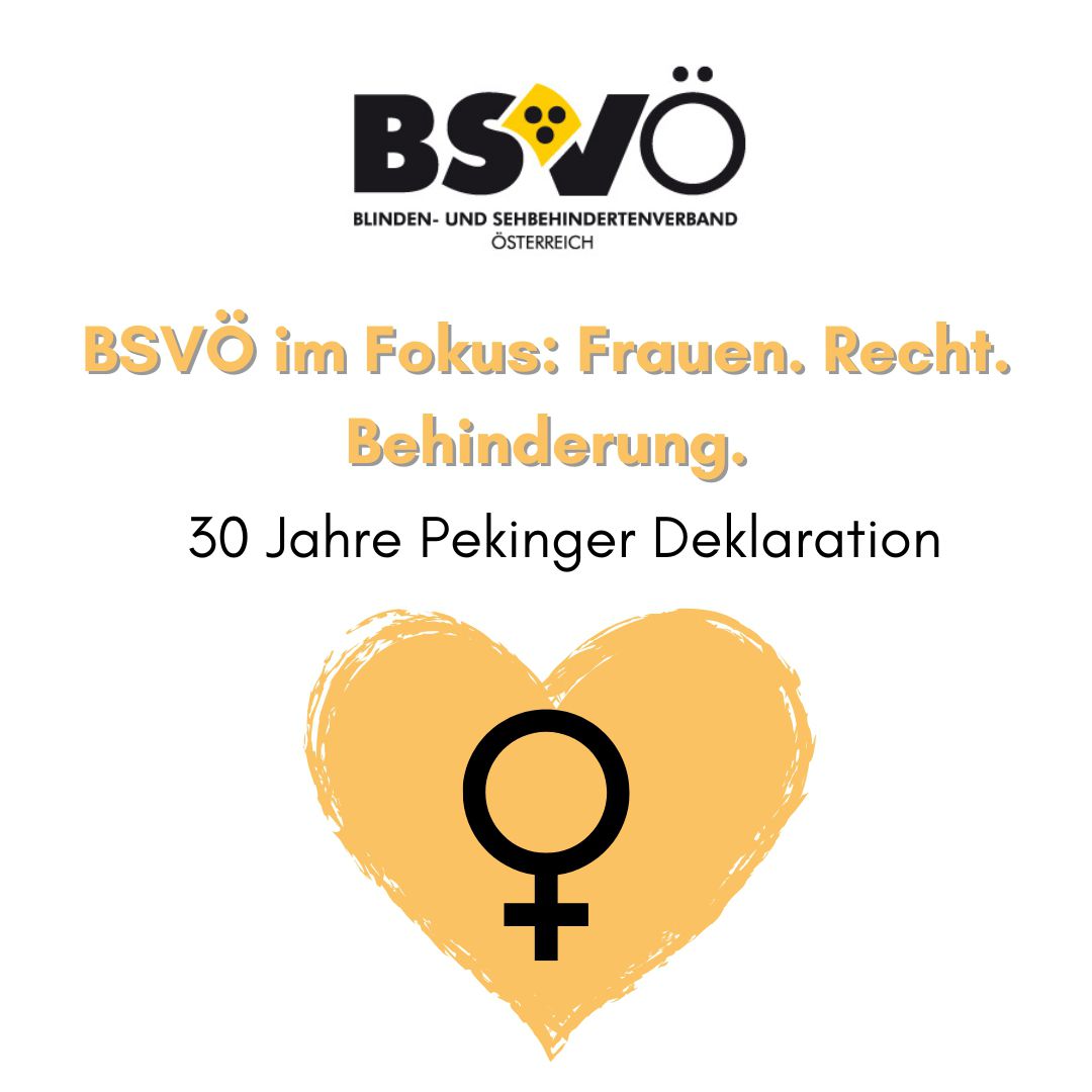 Logo BSVÖ, Grafik von Herz und Symbol für Frau. "BSVÖ im Fokus: Frauen. Recht. Behinderung. 30 Jahre Pekinger Deklaration.
