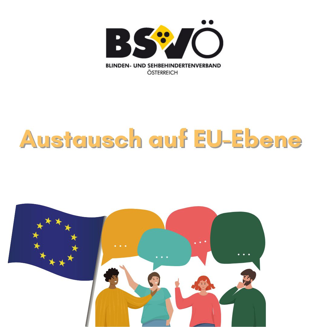 EBU präsentiert interessierten Europaabgeordneten ihre wichtigsten Anliegen für die neue Legislaturperiode. Grafik einer Gruppe an Menschen, EU Flagge. Logo BSVÖ