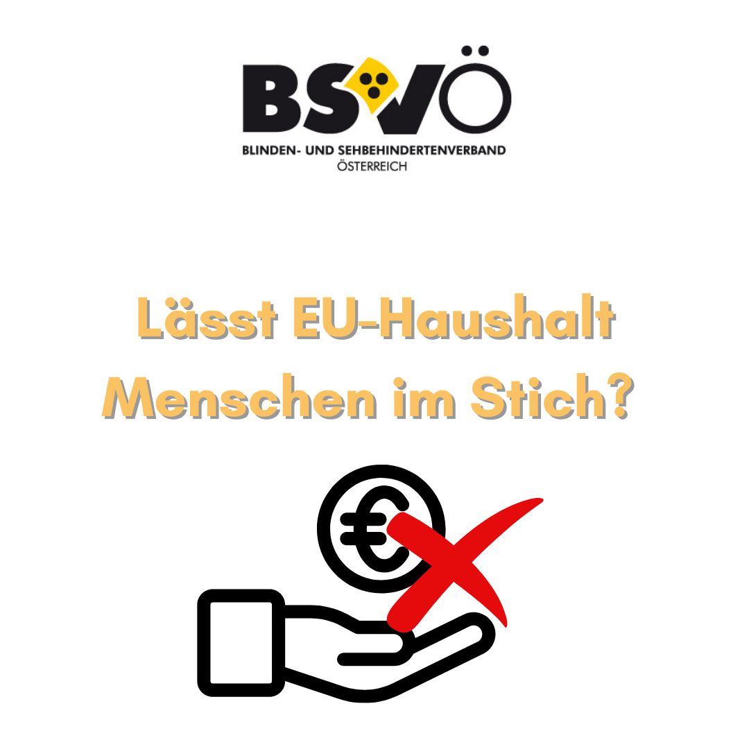 Lässt kommender EU-Haushalt Menschen mit Behinderungen im Stich? Logo BSVÖ, Grafik einer Hand mit Euro die durchgestrichen sind.