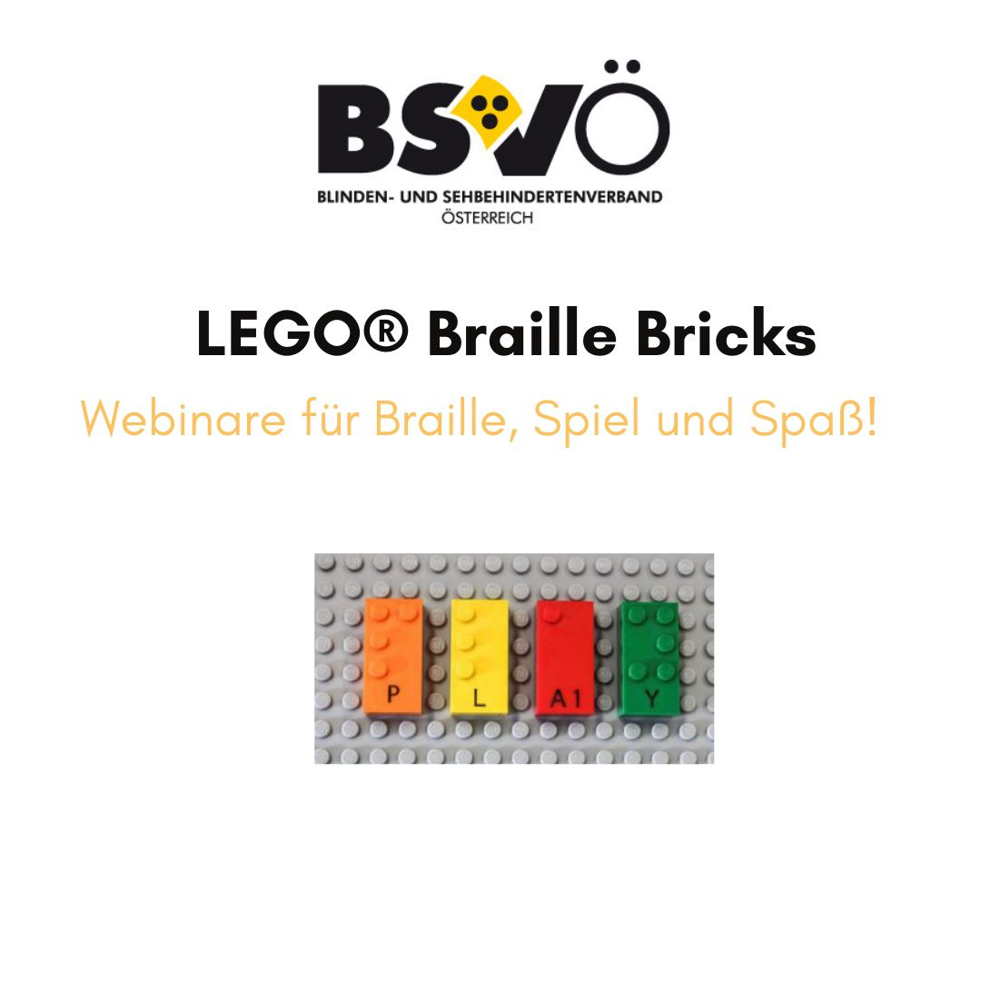 "LEGO® Braille Bricks, Webinare für Braille, Spiel und Spaß!" Logo BSVÖ, Foto von Braille Bricks die das Wort "Play" bilden.