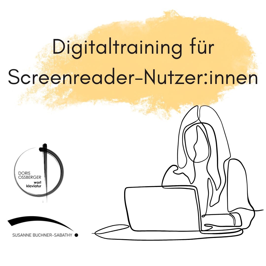 Logo Doris Ossberger/ Wortklaviatur. Grafik einer Frau an einem Laptop. "Digitaltraining für Screenreader-Nutzer:innen"