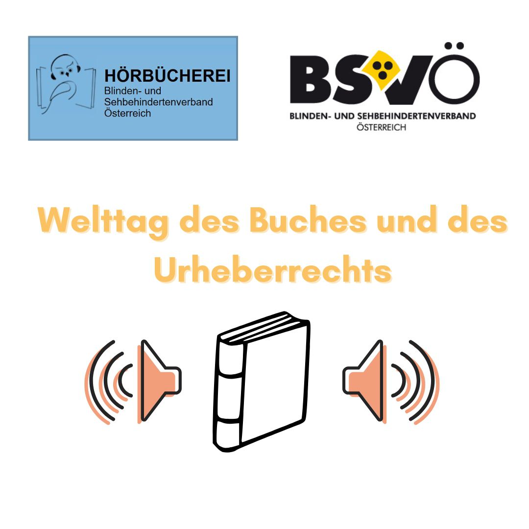 Welttag des Buches. Grafik eines Buches und Audiosymbole. Logos Hörbücherei und BSVÖ.