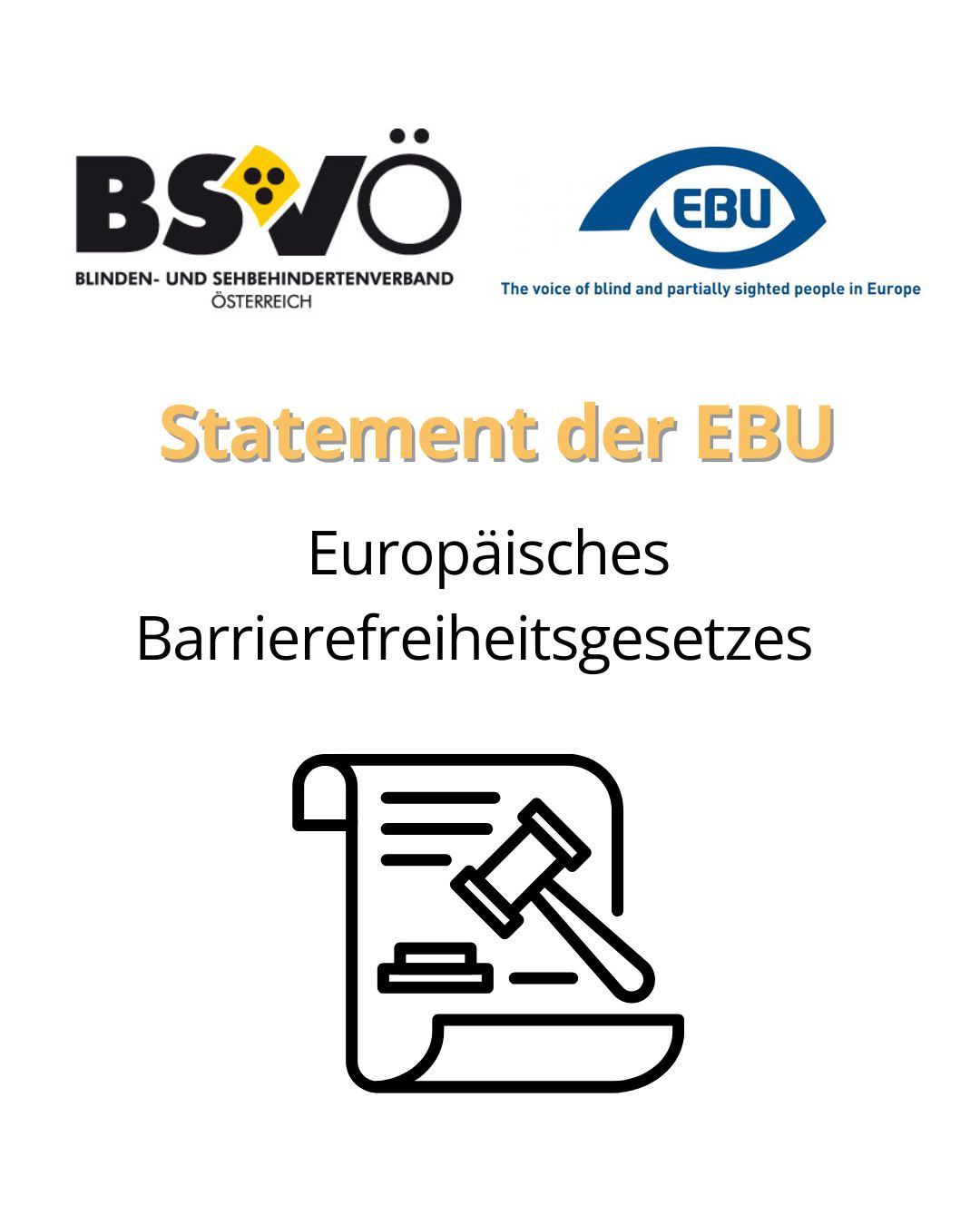 "Statement der EBU zur Umsetzung des Europäischen Barrierefreiheitsgesetzes " Grafik eines Gesetzestextes. Logo BSVÖ und Logo EBU