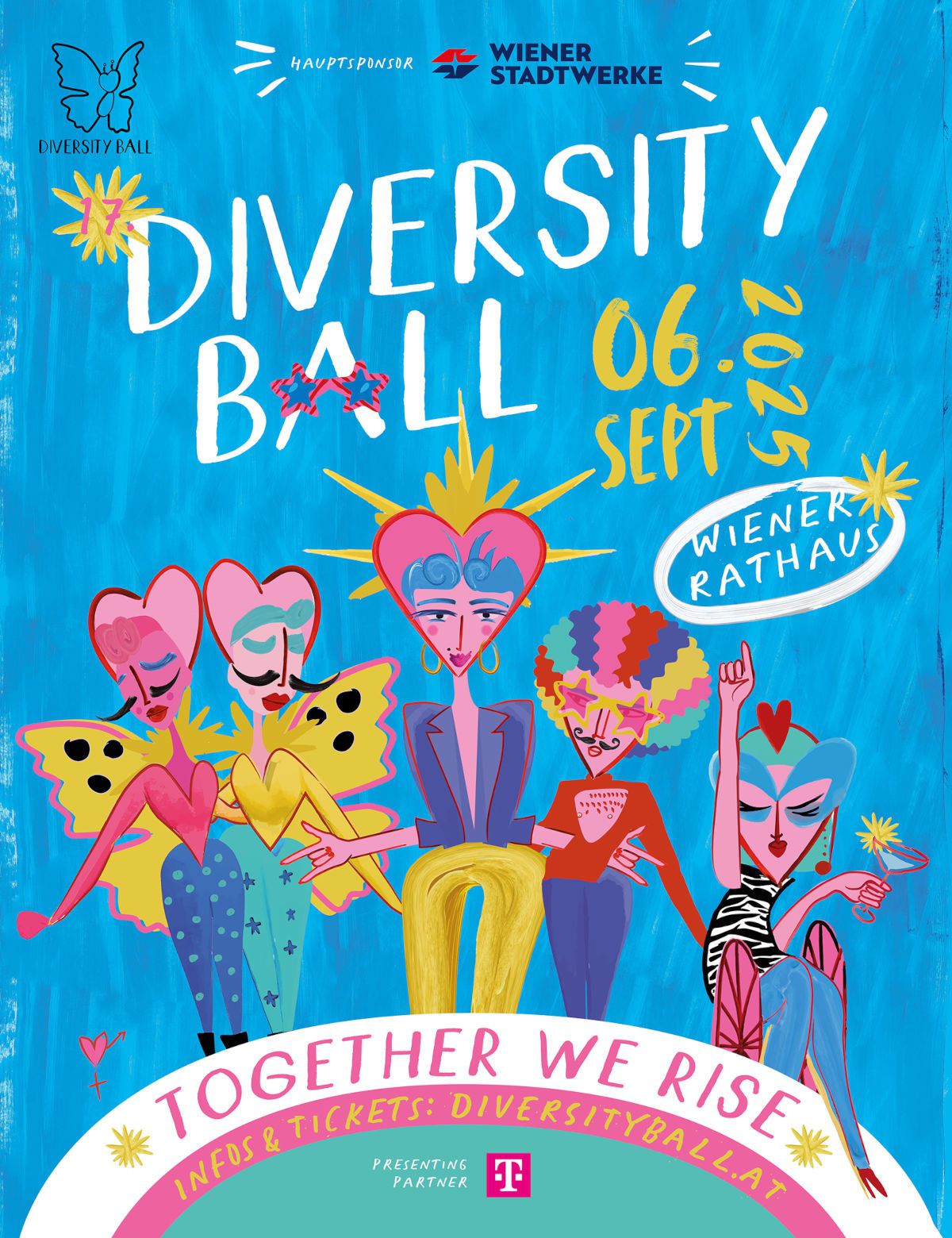 Plakat: "TOGETHER WE. RISE DIVERSITY BALL 2025" Darauf sind 5 Personen mit rosa, herzförmigen Köpfen und langen Wimpern zu sehen. Der Hintergrund ist hellblau. "Diversity Ball 06 Sept 2025. Together we rise"'