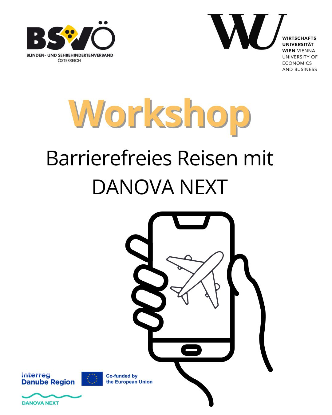 Workshop: Barrierefreies Reisen mit DANOVA NEXT – testen, mitgestalten, verbessern!Logo WU Wien, BSVÖ, DANova next. Grafik einer Hand mit Mobiltelefon.