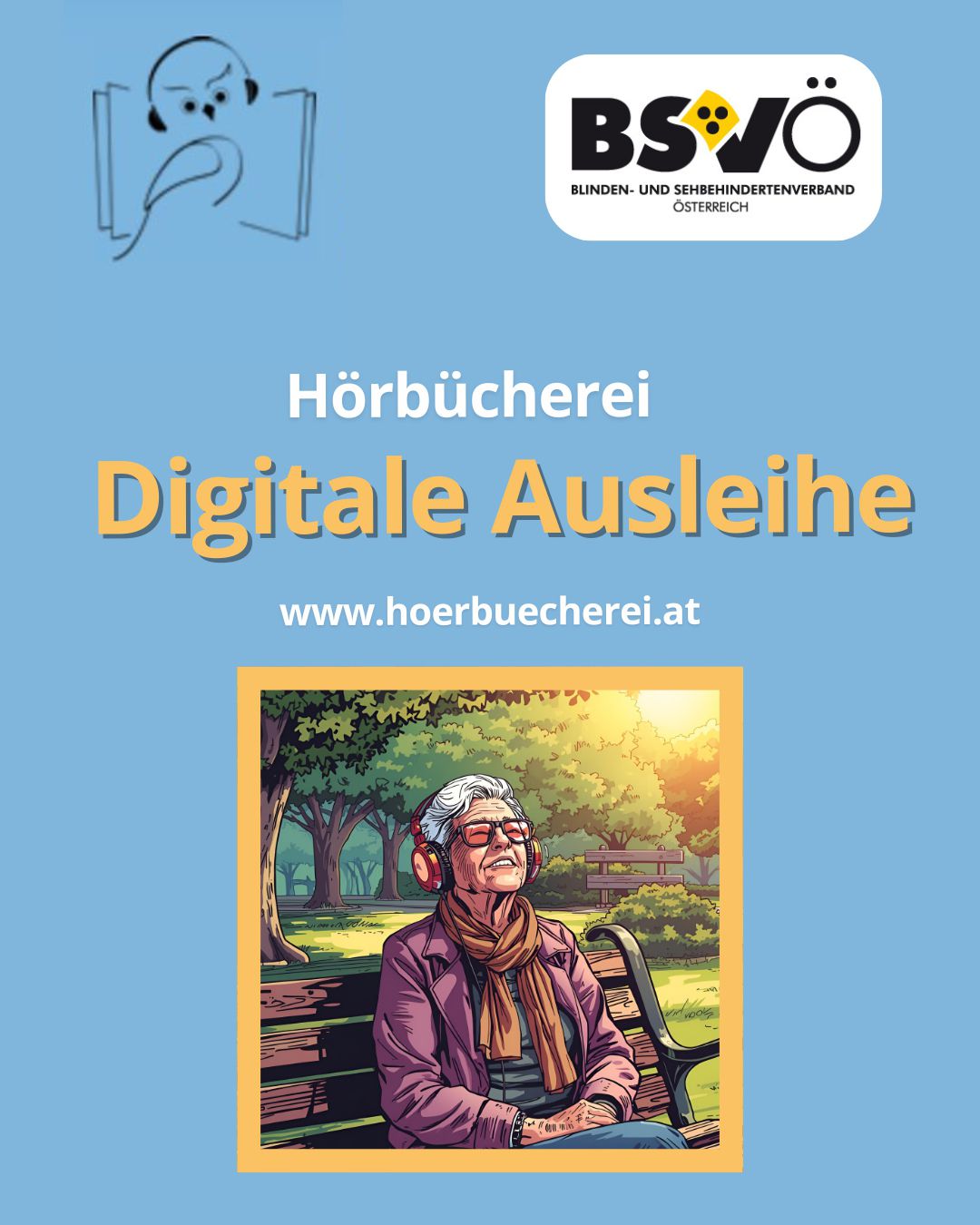"Digitale Ausleihe" Logo der Hörbücherei, Grafik einer älteren blinden Frau auf einer Parkbank, die mit Kopfhöreren einem Hörbuch lauscht.