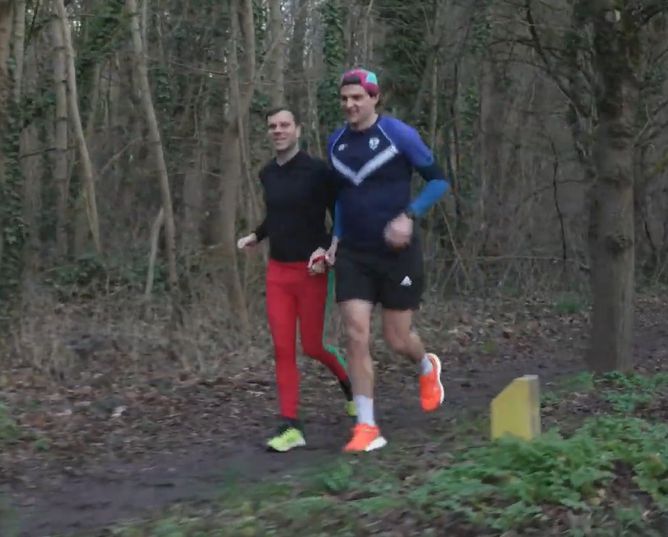 Screenshot des Films über Lars Bosselmann. Lars und sein Laufpartner beim Joggen im Wald.
