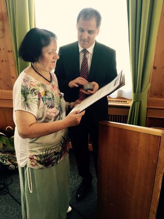 Präsident Dr. Wolf übergibt Veronika Haupt die silberne Ehrennadel und Urkunde des BSVÖ.