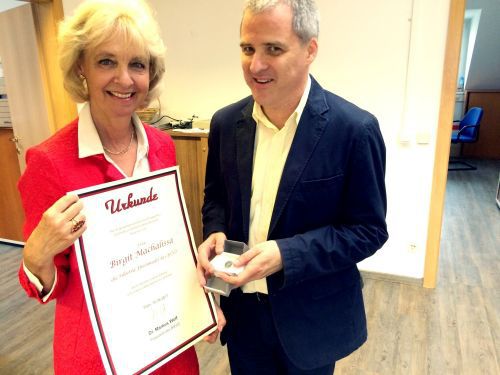 Birgit Machalissa wird von Präsident Dr. Wolf die silberen Ehrennadel und Urkunde des BSVÖ übergeben.