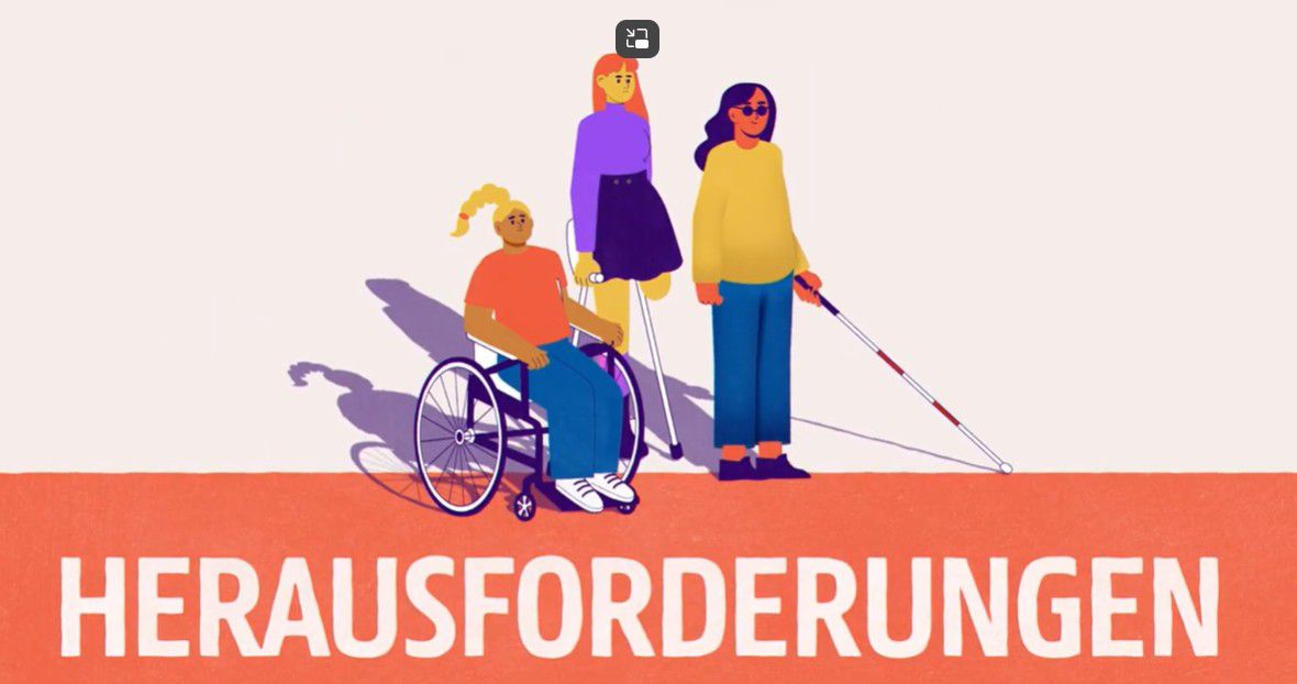 Screenshot aus dem Video. Drei Frauen mit Behinderungen, darunter das Wort: Herausforderungen.
