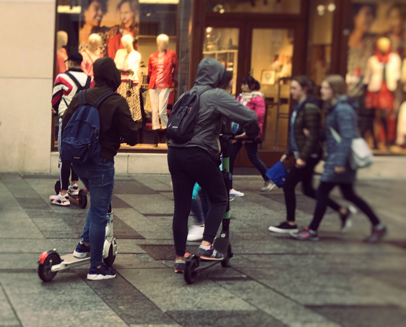 Jugendliche auf E-Rollern unterwegs in der Fußgängerzone der Kärtnerstrasse in Wien