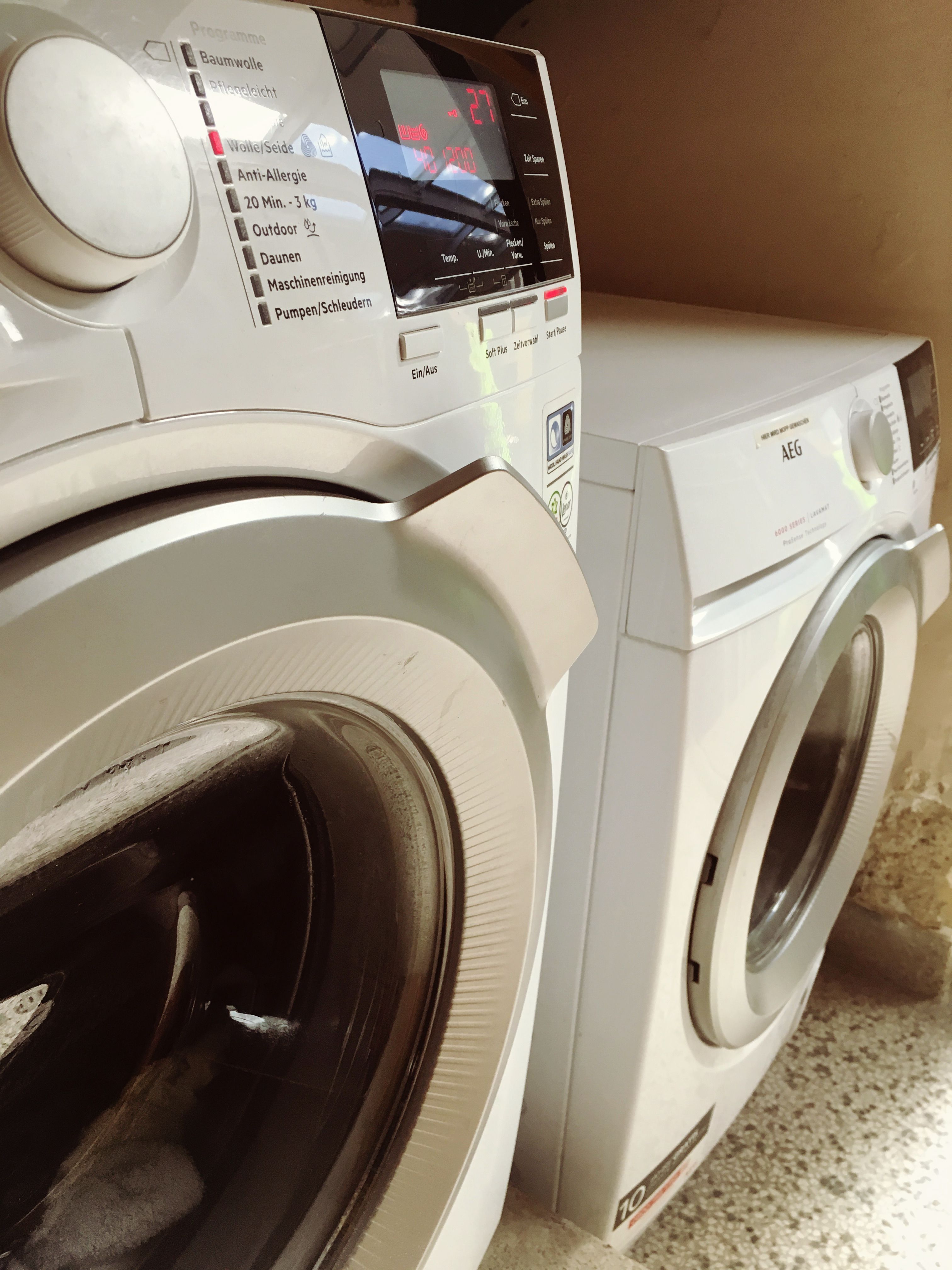 Zwei Waschmaschinen, die mittels Drehknopf bedienbar sind. Die Anzeige der Einstellung findet sich dennoch auf einem Display.