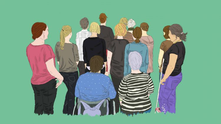 Frauen mit Behinderungen stehen in einer Gruppe mit dem Rücken uns. Die Gruppe ist gezeichnet, der Hintergrund mintgrün. Illustration: www.instagram.com/lille_illustration
