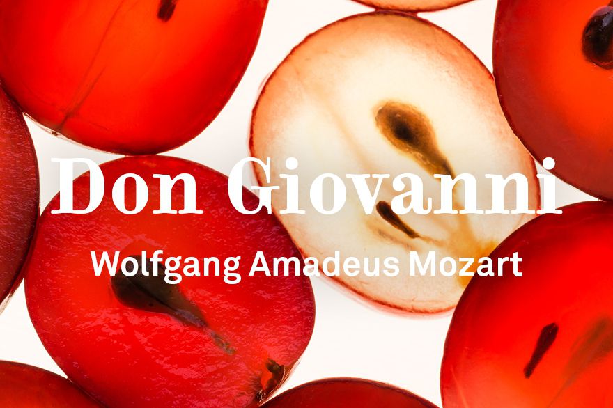 Ankündigung: Don Giovanni von Wolfgang Amadeus Mozart. Im Hintergrund: halbierte Weintrauben von unten beleuchtet sodass das Fruchtfleisch um die dunklen Kerne herum leuchtet.