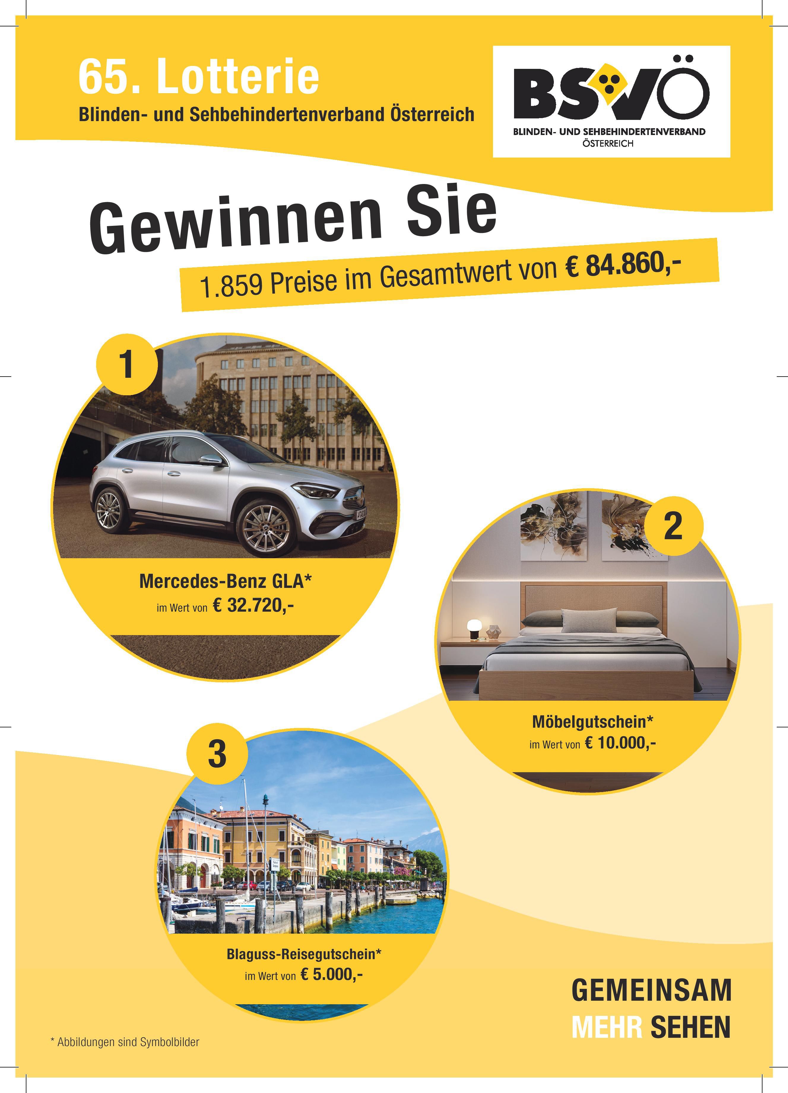Wie jedes Jahr startet auch heuer wieder die beliebte Wertlotterie des BSVÖ! Zu gewinnen gibt es einen schnittingen Mercedes-Benz GLA, Möbelgutscheine, Blagus-Reisegutscheine und vieles, vieles mehr. Seien Sie dabei! Um 1,50 Euro pro Los sind Sie dabei!