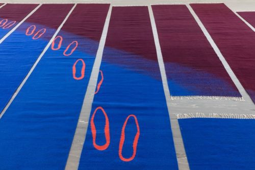 Polly Apfelbaum, "Deep Purple, Red Shoes", 2015 (Detail) Blauer Teppich, unterteilt in Segmente mit Mustern, die wie rote Schuhabdrücke wirken.