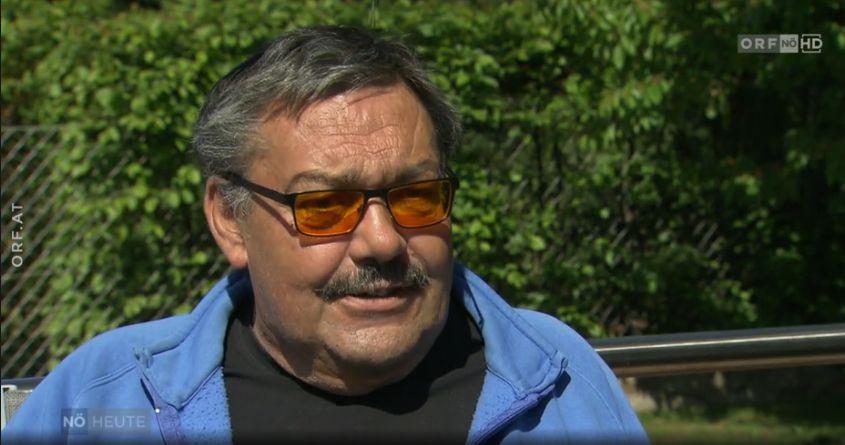 Screenshot der ORF-Sendung. Johannes Göls im Portrait. Er trägt eine getönte Brille und blaue Jacke. Schnauzer und Haare sind von der gleichen dunklen Farbe. Herr Göls sitzt in der Sonne in seinem Garten.