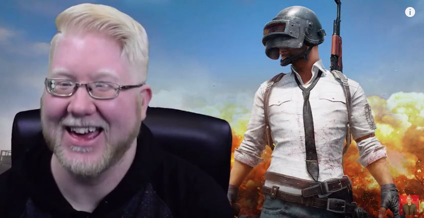Screenshot: Steve Saylor spielt Playerunknown's Battlegrounds. Im Hintergrund der Bildschirm mit dem Spiel, davor sitzt Steve Saylor und kommentiert das Spiel. Er hat hellblonde Haare und einen ebenso hellblonden Bart, trägt eine Brille und lacht.