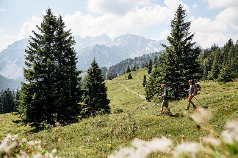 Eine Frau und ein Mann wandern durch eine bergige, sonnige Vorarlberger Landschaft.