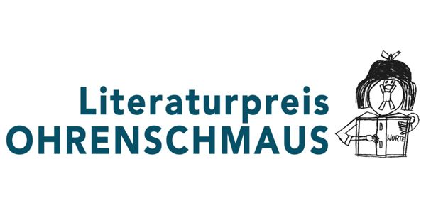 Logo: Schriftzug "Literaturpreis Ohrenschmaus" in Dunkelblau auf Weiß, daneben eine Figur, deren Oberkörper aus einem Buch besteht.