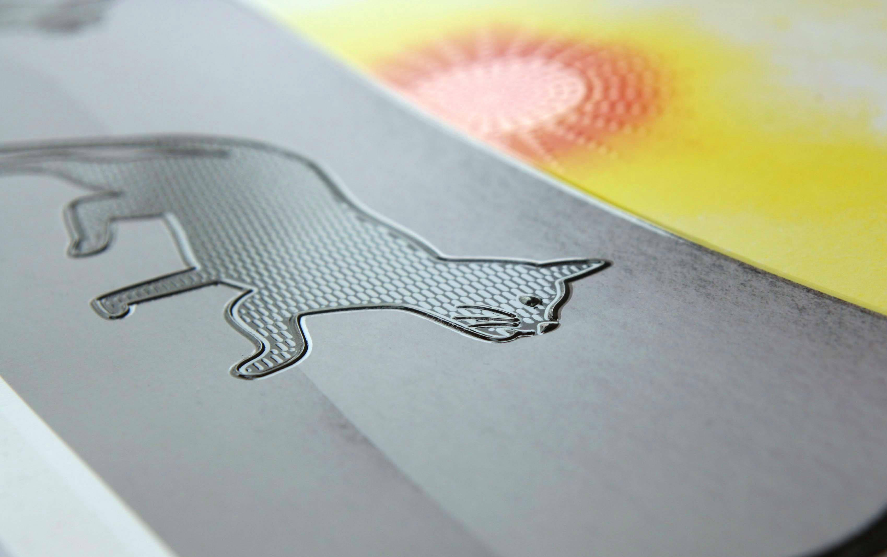 Ansicht einer Seite aus dem Kinderbuch "Wo ist Luna?" Eine Katze ist vor einem Sonnenuntergang unterwegs. Ihre Oberfläche ist - ebenso wie die Sonne - taktil.
