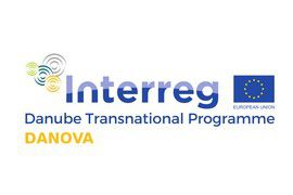 Projektlogo: Interreg Danube Transnational Programme. DANOVA. Blaue und gelbe Schrift, daneben die Europaflagge.