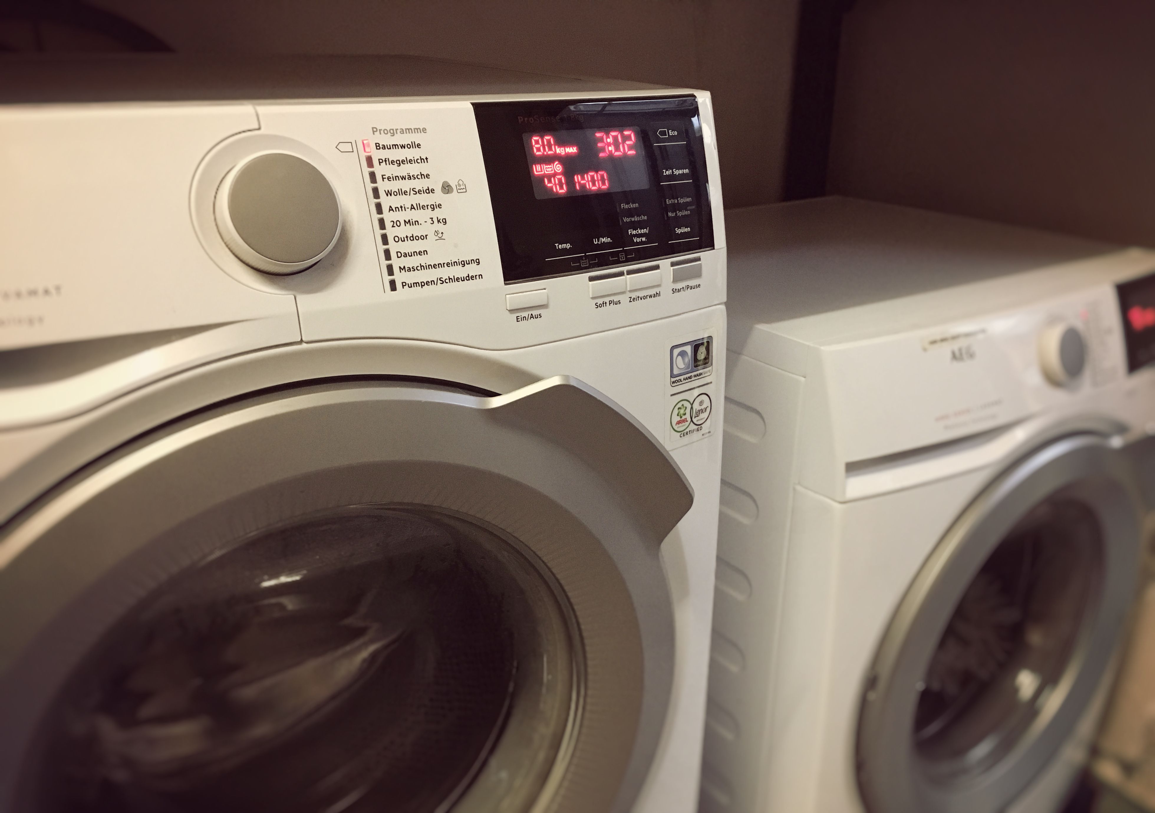 Zwei Waschmaschinen mit Drehknopf und einem Display, das mittels Berührung bedient werden muss.