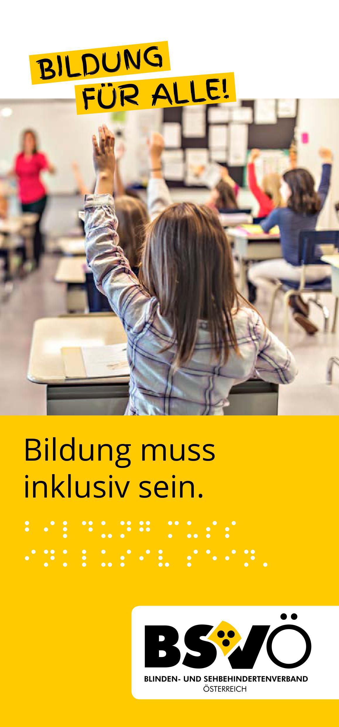 Folder Bildung: in einem Klassenraum, alle Kinder zeigen auf. Gerahmt vom Titel des Folders: Bildung für alle! Bildung muss inklsuiv sein. Logo des BSVÖ